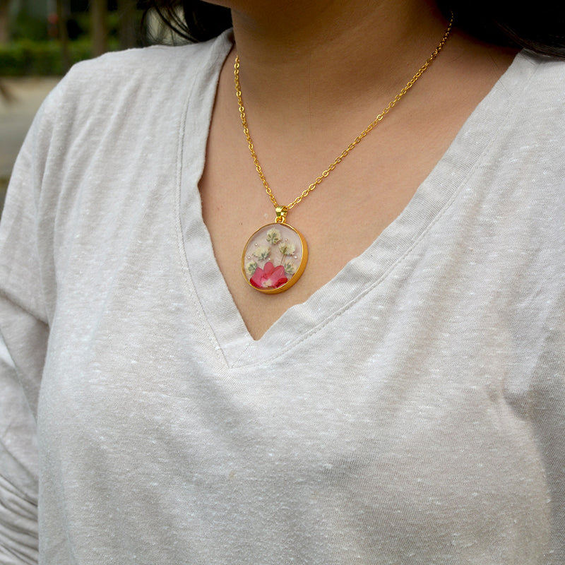 Radiate elegance with Shimmering Bloom, a handcrafted necklace featuring real dried flowers encased in resin. Lightweight, eco‑friendly, and timeless, it’s a wearable piece of nature’s beauty.