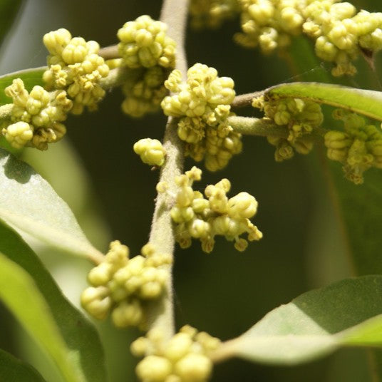 Putranjiva is a famous, moderate-sized, evergreen tree. It has pendant branches and dark grey bark having horizontal lenticels. Leaves are simple, alternately arranged, dark green, shiny, elliptic-oblong, distantly serrated. Fruits ellipsoid or rounded drupes, brown in colour; seed normally one, stone pointed, rugose, very hard. Lush, dark green foliage gracefully drapes tall deep gray branches of this large evergreen tree that grows up to 12 meters and is found along riverbanks, valleys and forests of East Asia. Small yellow-green flowers crowd among the canopy, almost inconspicuous among leaves.