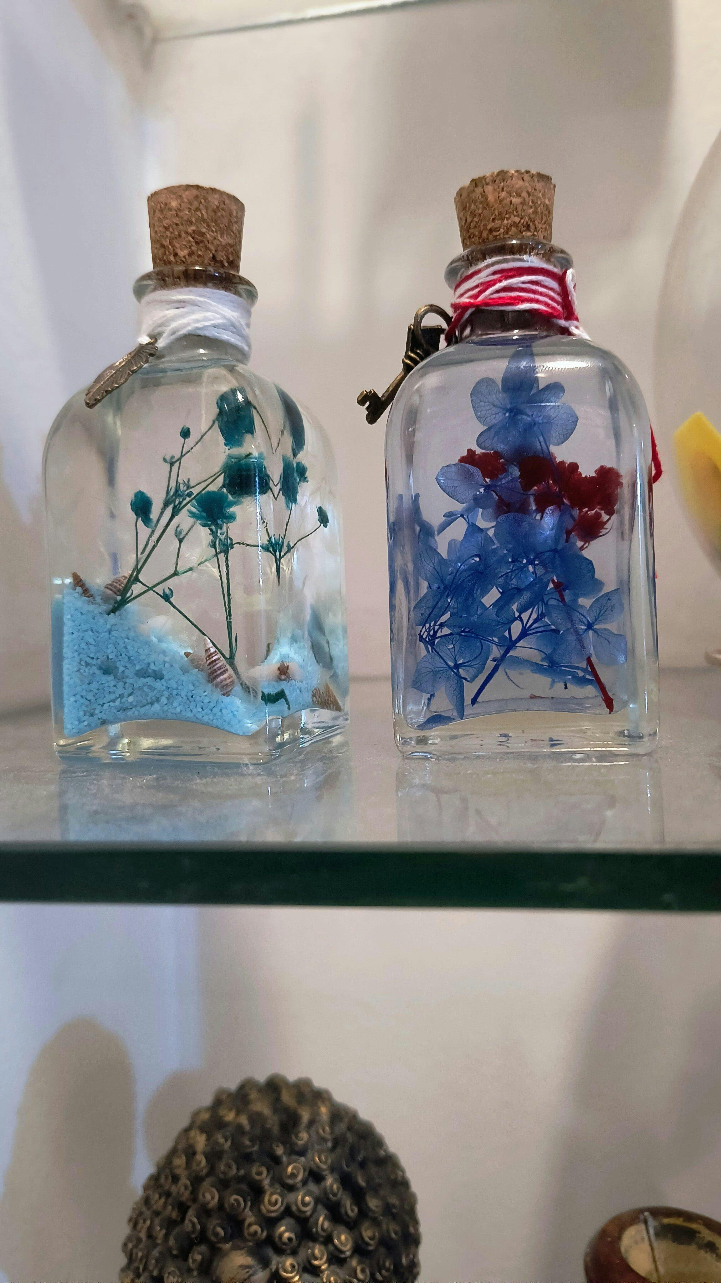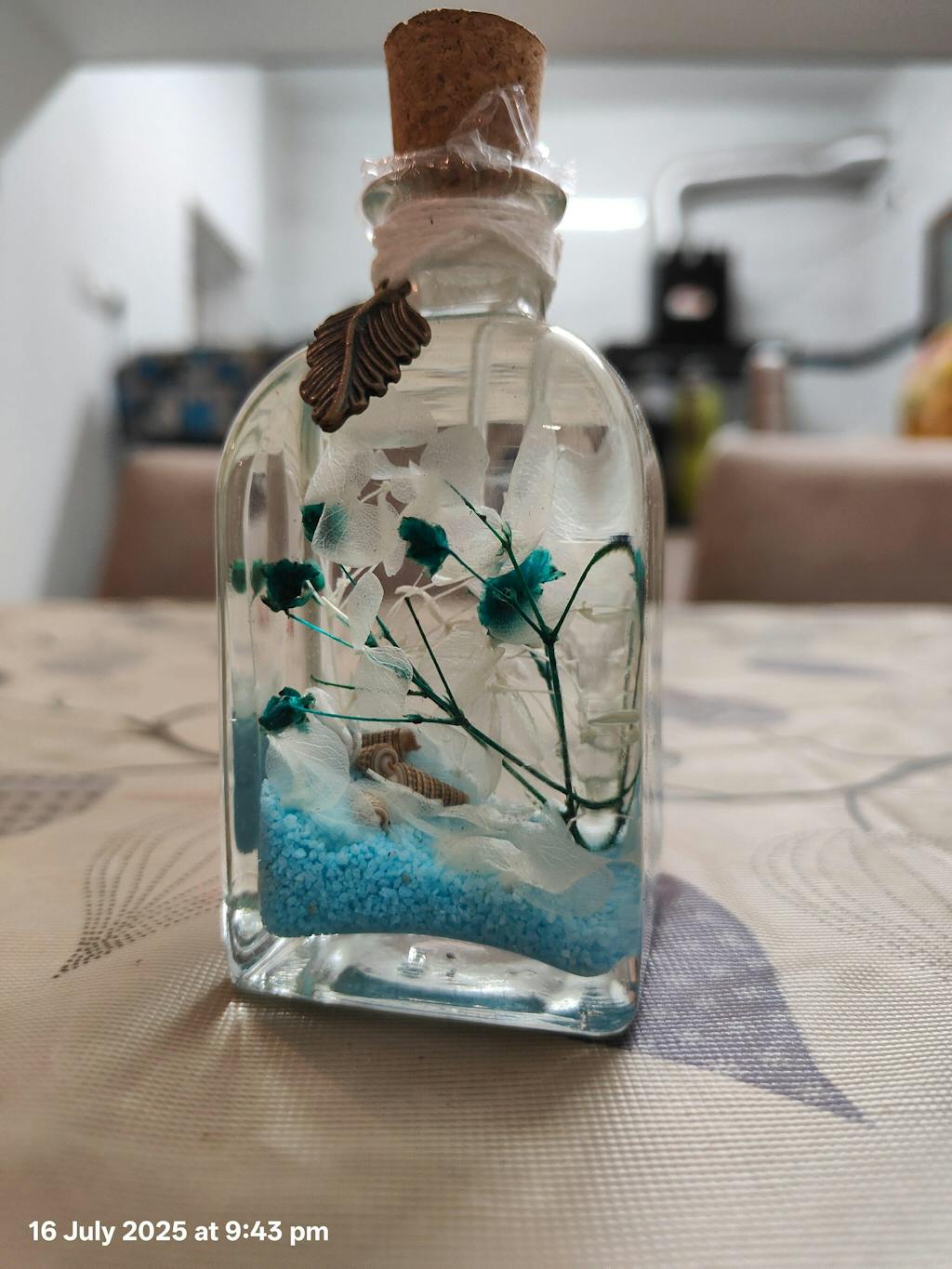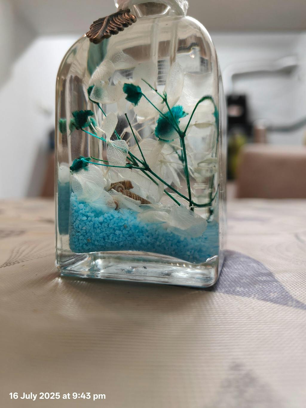 Material Used : Glass Bottle with Cork, Hydrangea, Baby's Breath, Feather Charm