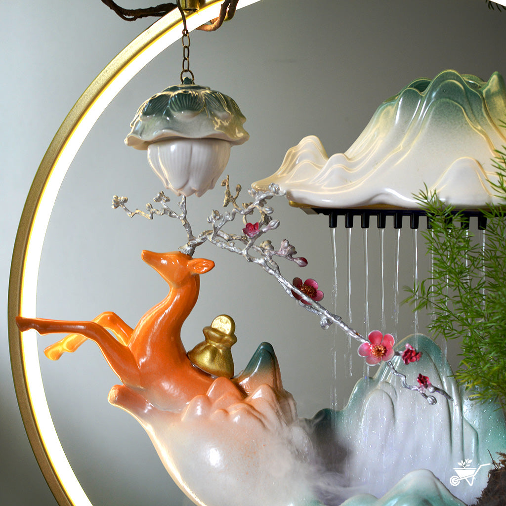 The Celestial Ascent fountain captures a timeless moment — a deer in graceful motion, ascending toward serenity. Framed within a glowing golden ring, this ceramic masterpiece showcases a dreamy mountain landscape, blooming branches, and a delicate mist that swirls gently at the base.