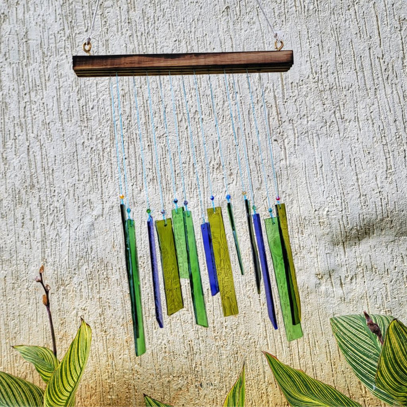 Windchime made by cutting and polishing strips of glass from wine bottles to create an upcycled and a very melodious decor which not only is melodious but upcycled too and reduces our carbon footprint.