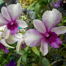 Dendrobium orchid plants are epiphytic by nature and require good light and ventilation. The antelopes typically have twisted sepals and upright, twisted petals that suggest an antelope s horns, and have a wider color range. The Dendrobium orchid flower occurs in almost every imaginable color. The flower spikes can be over two feet tall with over twenty blooms on them. The flowers last for 6 to 8 weeks and they make excellent cut flowers. The blooms are all the colors of the rainbow - pinks, lavenders, reds, yellows, oranges and many mixed color combinations. Lavender or white flowers are borne in profusion on a well-grown plant and are long lasting. They are a prolific group in which offset plantlets are frequently produced on the cane. When each offset has produced several aerial roots, it can be cut from the parent plant and will frequently flower after one year of growth.