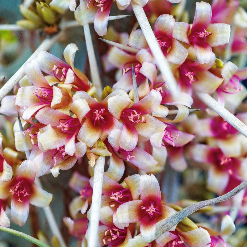Didierea Badagascariensis is a spiny, succulent thorn-bush tree which can reach 4 to 6 meters,columnar at first, later branching. These hardy drought-resistant plants appear as a spine-encrusted mass of branches. The thin, grayish-green strip-like, dry deciduous leaves are well protected between the large, branched spines. Blooming occurs during the spring and the blossoms are borne at apex of the stem. The flowers are funnel-shaped, pinkish-white with pink stamens and very beautiful. The flowers are inconspicuous and male and female flowers appear on separate plants.