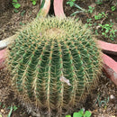 A globular entity, this green colored cactus has prominent spine-edged surface along with ribs and areoles. This plant differs from the common Golden barrel cactus (Echinocactus grusonii) only for the very short spines. Except for the spines it is identical in shape and size to the standard species. It has a single slowly growing globe-shaped stem that became elongated (barrel-shaped) in maturity, up to 90cm (180cm) in height and spread. This stemis pale green and heavily ribbed with numerous areoles sprouting radial, yellow spines. They normally offset with advanced age and a few multiples occur even at small sizes.The flowers are produced from end of spring to summer only on larger mature specimens receiving enough full sun. Flower are diurnal, vivid yellow (4-5 cm wide) and form a circular ring at the top of the plant, but are not very visible being small in relation with the size of the barrel, and lost into the creamy coloured wool at the plant apex.