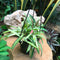 Hoya kentiana 'Variegata' is a very special draping house plant. New growth has brilliant pink variegated leaves that fade to an inconsistent green white variegation; creating an attractive umber effect. Over time kentiana 'Variegata' can become quite long and full.