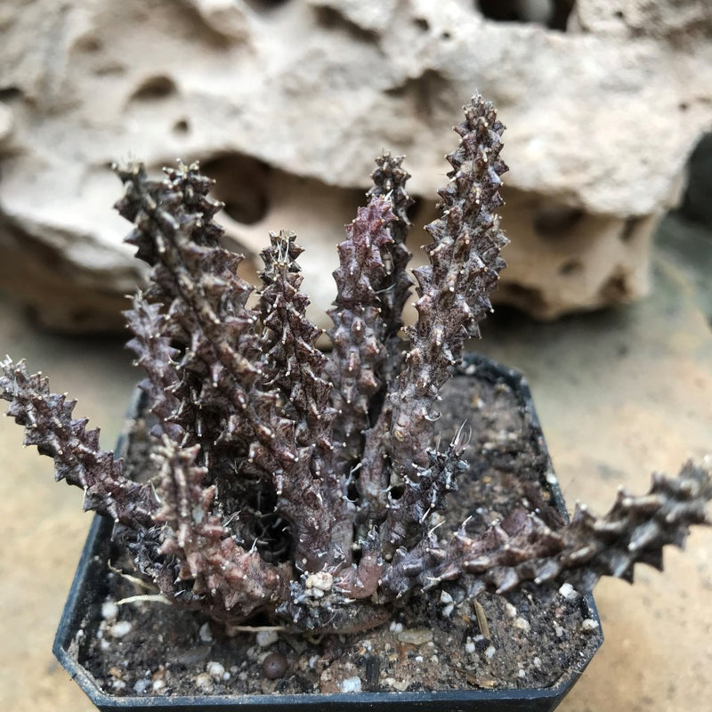 Huernia erinacea is a pretty tropical, floriferous species with 5-angled thin dark green stems with some red mottling. The plant produces an abundance of star-like flowers developing in succession. Flowers are yellow mottled with red and covered with short red-tipped teeth.