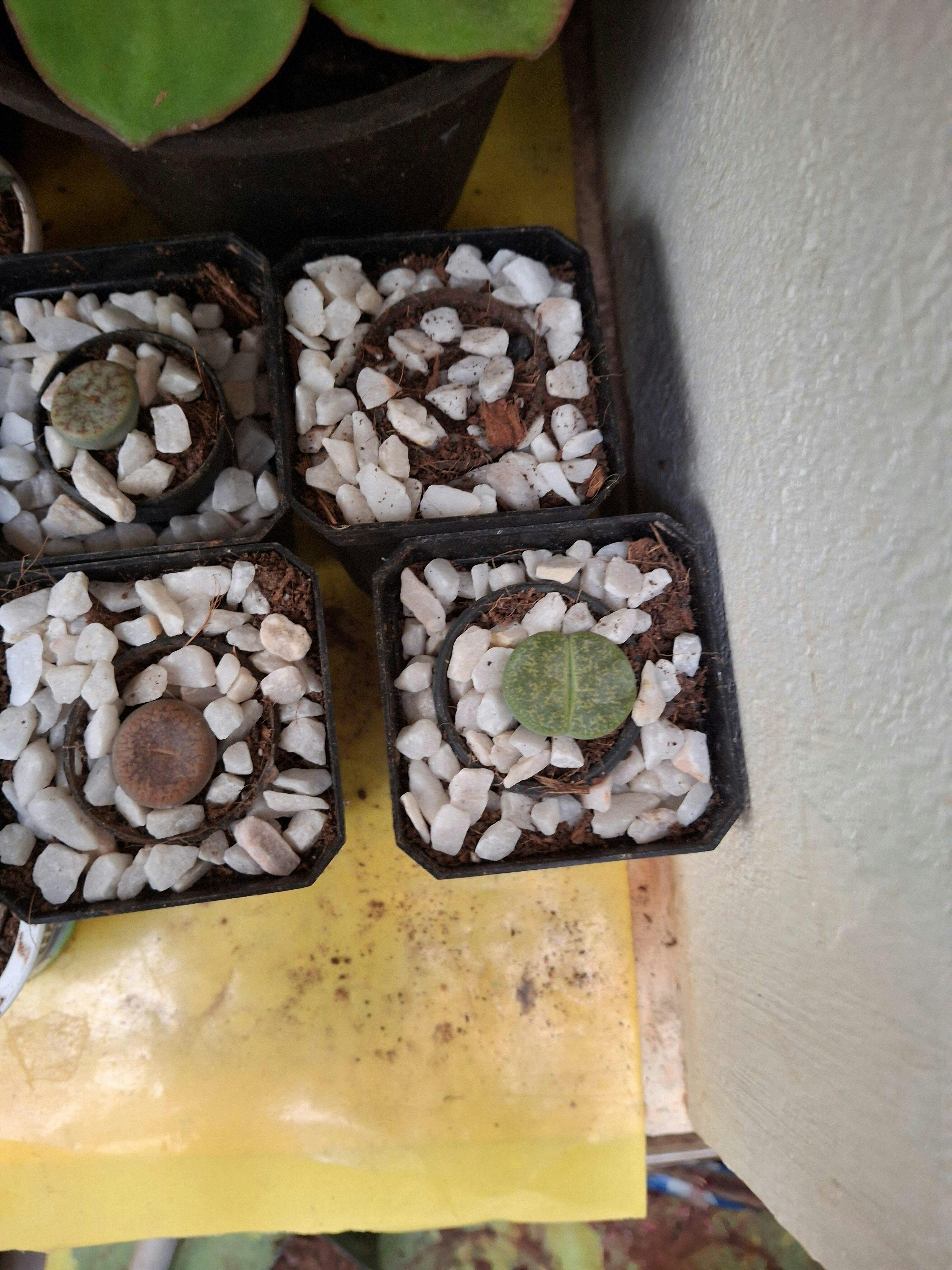 Lithops require a loam-based compost with the addition of extra drainage material such as horticultural grit or perlite. Position the plants in the soil so that about three-quarters of the height of the plant remains above the soil level to permit the plant to breathe . Collapse the hole around the taproot by carefully poking a pencil into the soil near the plant. Set a few pebbles among the plants and finally sprinkle a thin layer of coarse sand (or bird gravel) over the exposed soil.