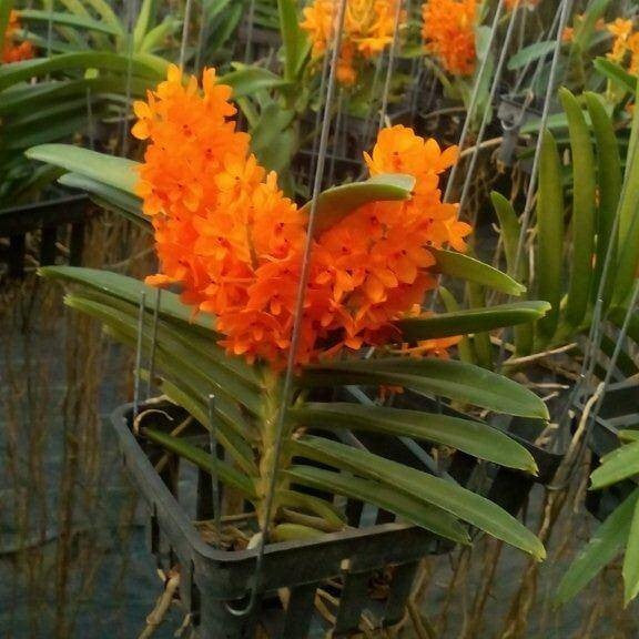 The family of Vanda orchids is all epiphytic, which means the plants cling to tree bark or hand from cracks in cliffs and rocky areas. Vanda's need high humidity and high temperatures, bright light (but generally do not thrive in full sunlight.) and turbulent air flow.