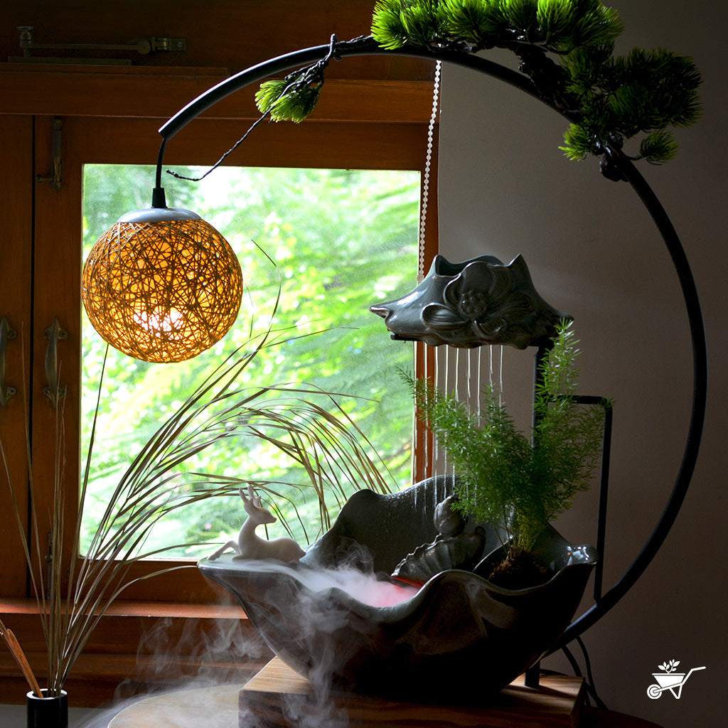 Material used : Ceramic Statue, Ceramic Water Holder, LED Light, Wooden Stand, Artificial Bonsai for LED, Water Pump, Atomizer