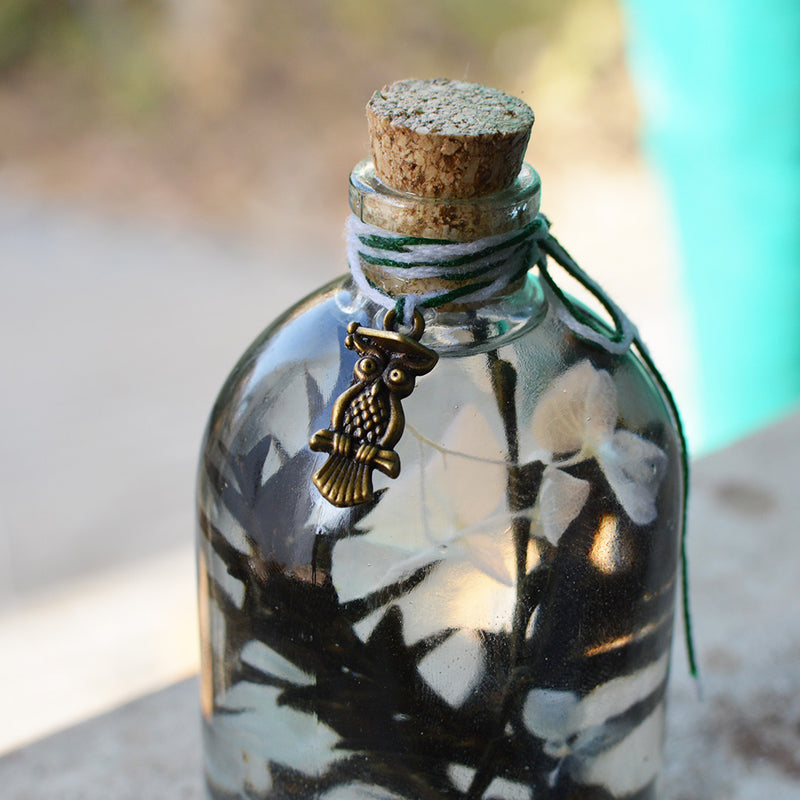 Material Used : Glass Bottle with Cork, Hydrangea, Fern, Owl Charm, Oil.